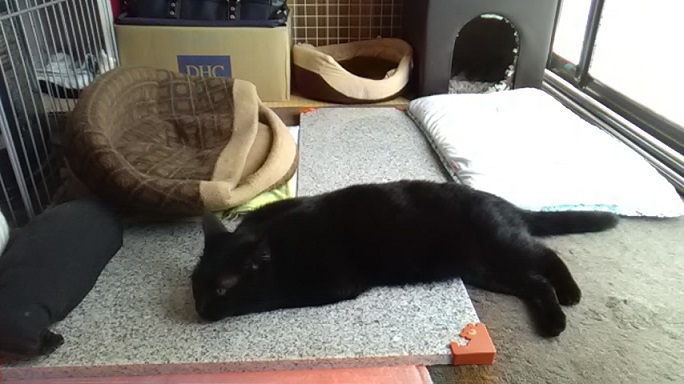 御影石プレートに1匹で寝ると、広々とした感じで寛ぐ事が出来るし、上半身だけで寝る場合もあります。