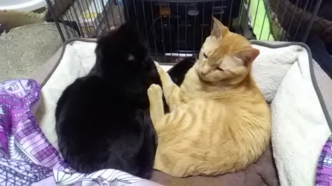 しかし、2日目には同じ部屋で過ごしてくれるようになり、3日目には虎治さんと黒猫ブラザーズが挨拶を交わしだし、鋼さんが同じ猫ベッドで寝てくれるようになりました。