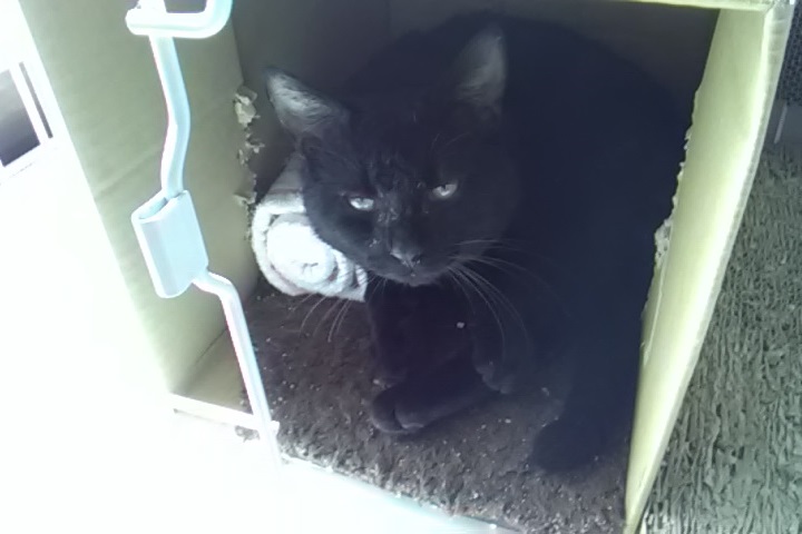 さて、一晩明けた今朝は、まだ手術の痕が痛むのか、段ボールの中で大人しく寝ていました。