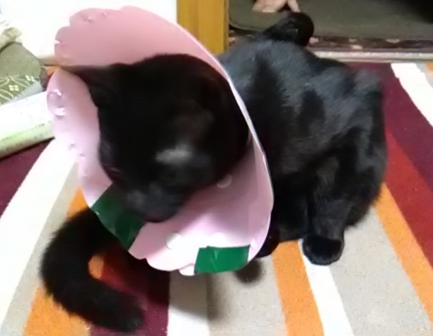 んで、手術跡を舐めようとして、エリザベスのフチで手術跡を擦ってしまっているようなので、エリザベスを少し大きくした方がイイですね。