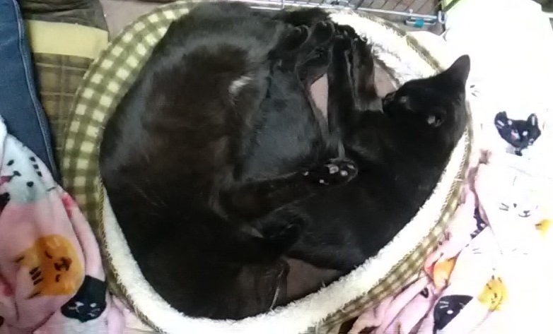 夜寝る時も、鋼さんが私の布団の上で寝てると、鍵さんが『どこ~?』って感じで鳴くと、鋼さんが鍵さんの所へ行ったり、鍵さんが鋼さんの所へ来たりして、兄弟仲良く寝ています。