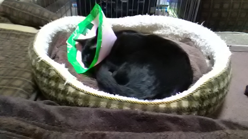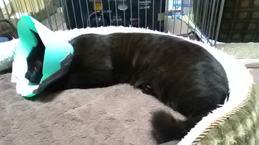 んで、手術跡を舐めようとして、エリザベスのフチで手術跡を擦ってしまっているようなので、エリザベスを少し大きくした方がイイですね。