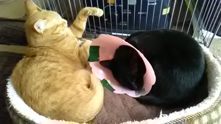 エリザベス装着してる間、鍵さんと離れて寝ていたのに、今は仲良く寝ています♪