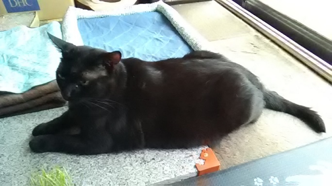 今までは、机の下によく隠れていましたが、表に出て来て、のんびり過ごしています。