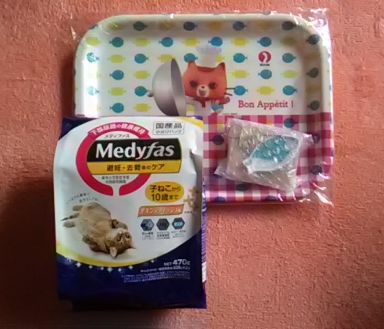 プレゼント商品は、にゃねっとハウス、にゃねッとオリジナルトレイ、猫の箸置き、にゃねっと風呂敷、にゃねっと御手富貴、にゃねっとチョイチョイBOX、メディファスの避妊・去勢後のケア 子ねこから10歳まで チキン&フィッシュ味470gです。