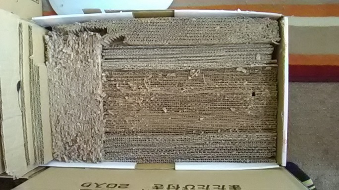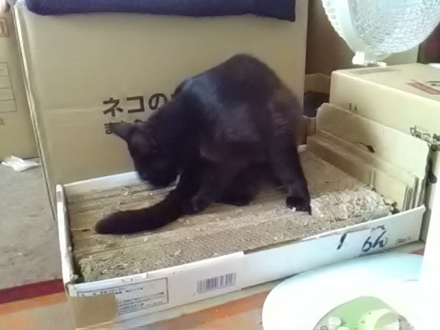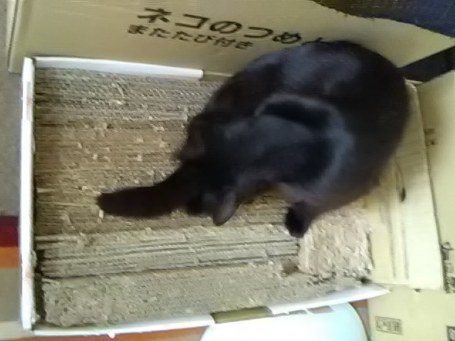 箱が大きかったので、一部、古い爪とぎも入れてサイズを調整しています。