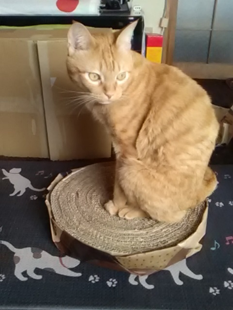 解体した段ボールを全部使って、直径約35㎝の丸い爪とぎが出来ました~♪ンニャ ヘ(^‥^=ヘ)~ ~(ノ=^‥^)ノ ヘ(^‥^=ヘ)~ ~(ノ=^‥^)ノ ンニャ♪