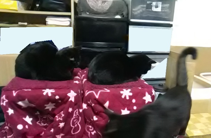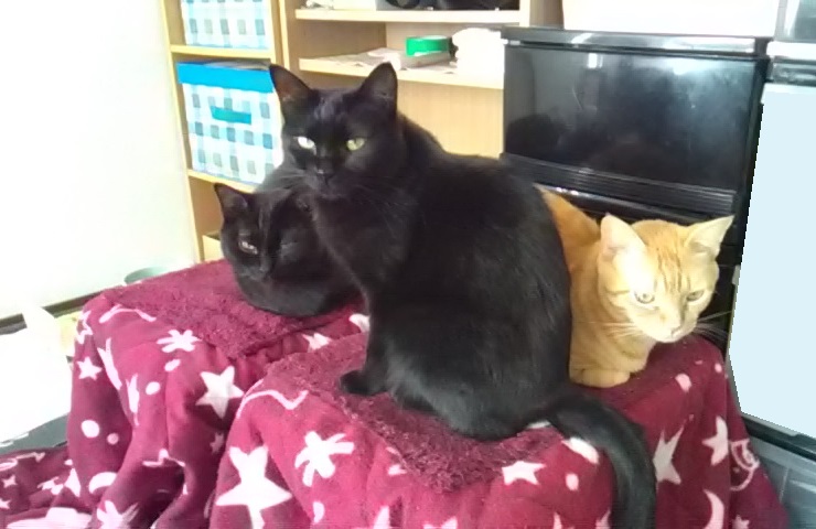 時には、上に2匹乗っていて、こたつの中に入るという事もあります。