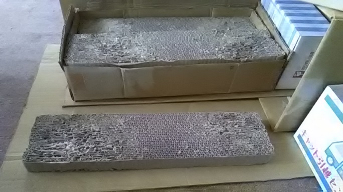 使い続けてると段ボールの目(?)が潰れて来るんですが、真ん中はの方は、まだ使えそうです。