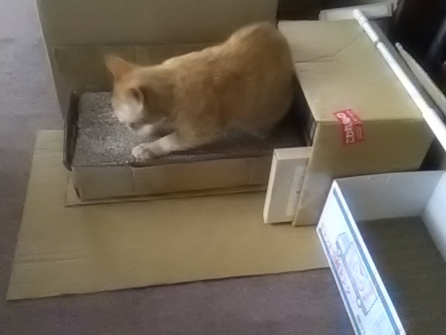 爪を研いだ後にダンボールのカスが落ちる事も考えて、下に大きめの段ボールを引いて、こんな感じで置いてみました。