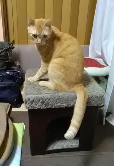 とりあえず、組立てて部屋においてみると、虎治さんが乗ってくれました。
