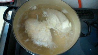 鍋にお湯を半分ほど沸騰させ、そこへ、鶏胸肉を投入する。