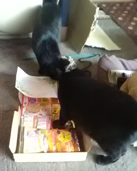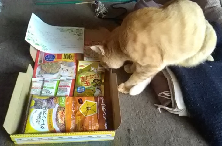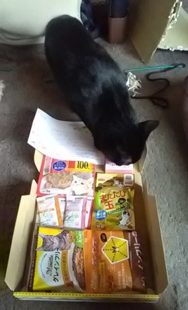 猫達は大喜びで、代わる代わるに商品を取り囲み匂いをフンフン嗅いでいます。