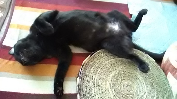 虎徹さん、動物病院から帰宅後、気持ち良さそうにヘソ天でお昼寝をしていました。